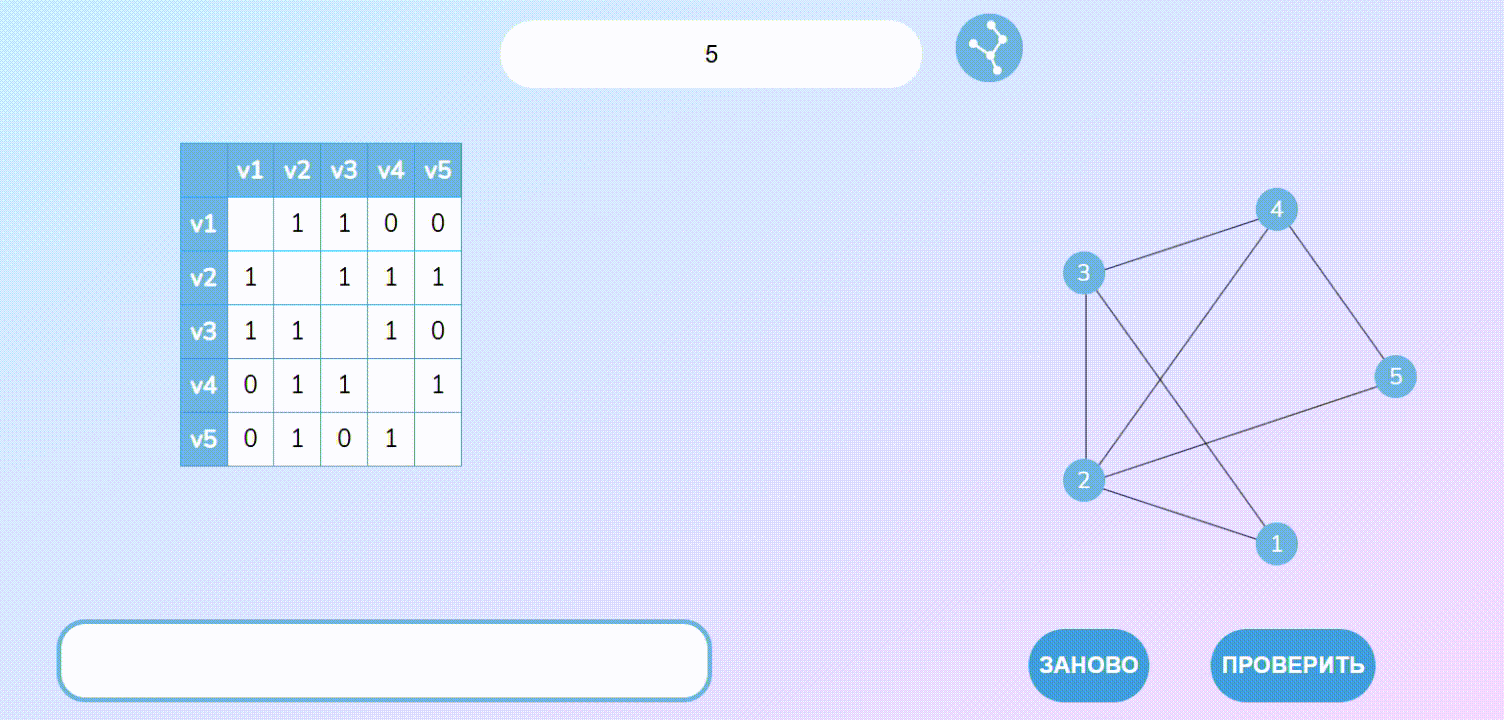 Задан граф матрицей смежности, введите обход в глубину. Система проверяет правильность.